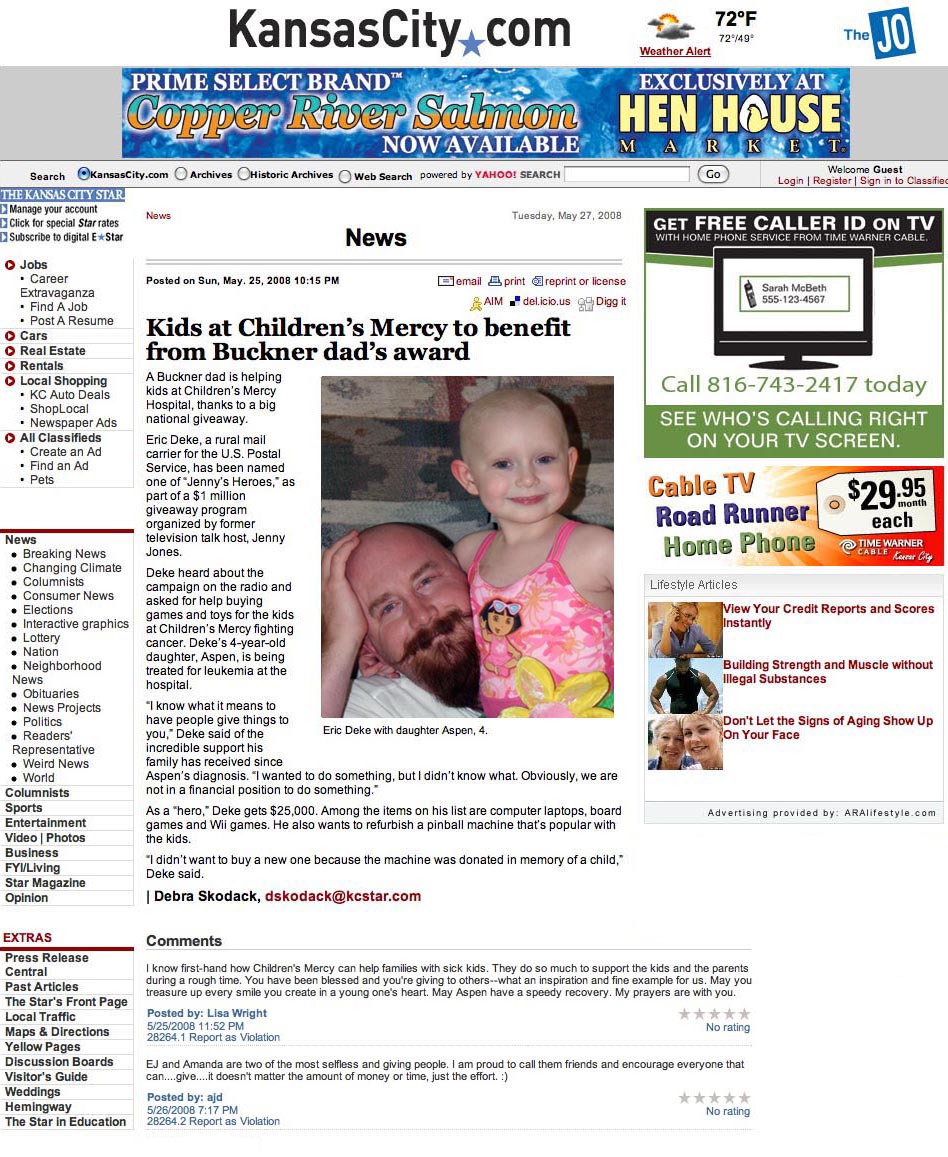 Eric Deke is a rural mail carrier from Buckner, Missouri. His request of $25,000 is to provide new toys, movies, video games, board games, washable laptops, and portable Nintendo Wii Fun Centers for the cancer patients at Children's Mercy Hospital in Kansas City, Missouri where his 4-year-old daughter, Aspen, is a patient. Aspen has ph+all leukemia so Eric has spent a good deal of time at the hospital.