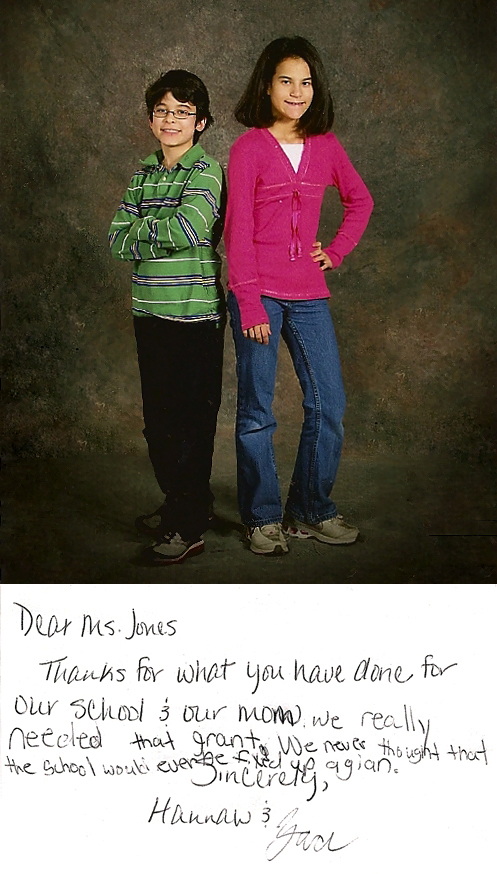 Jackie had this to say about my phone call. " I am still in a state of shock. I am on cloud nine right now. Mr. Knowles, the Assistant Principal, told my husband this could not have come at a better time. The State Board of Education, as of October 1, has budget cut backs. Why? It's so crazy. These kids are our future. I have to be honest; I really had pretty much thought I didn't get it. I guess that's why I was so ELATED and speechless. I didn't know what to say."