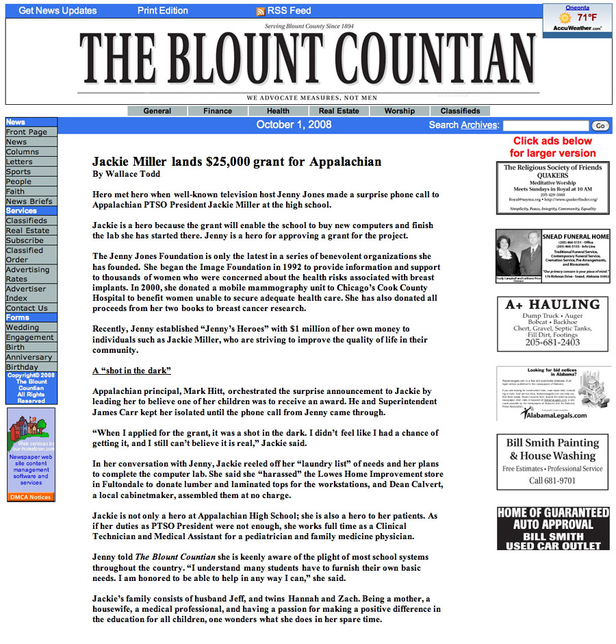 10/02/08: Kevin Wallace wrote... "Jackie, Thanks for your dedication to making a difference in the lives of Appalachian students. I don't think Jenny could have chosen a better "hero"! We are so excited for you and Appalachian High School."