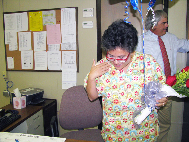 I surprised Jackie today with the news of her grant. We had a great ally in the school principal, Mark Hitt, who staged an elaborate (pretend) meeting. He asked Jackie to come in because one of her children was receiving an award, so she took off from work to be there. In reality, her husband, mother-in-law, and her children were there as well as the county superintendent, a newspaper reporter, and several teachers. Jackie was emotional on the phone and told me that they have been trying to put a computer lab in the school for some time. She even "harassed" the manager of Lowe's into donating wood for the table top so we know she means to get things done. Well, now she'll have a lot to do, and will have $25,000 to do it with.